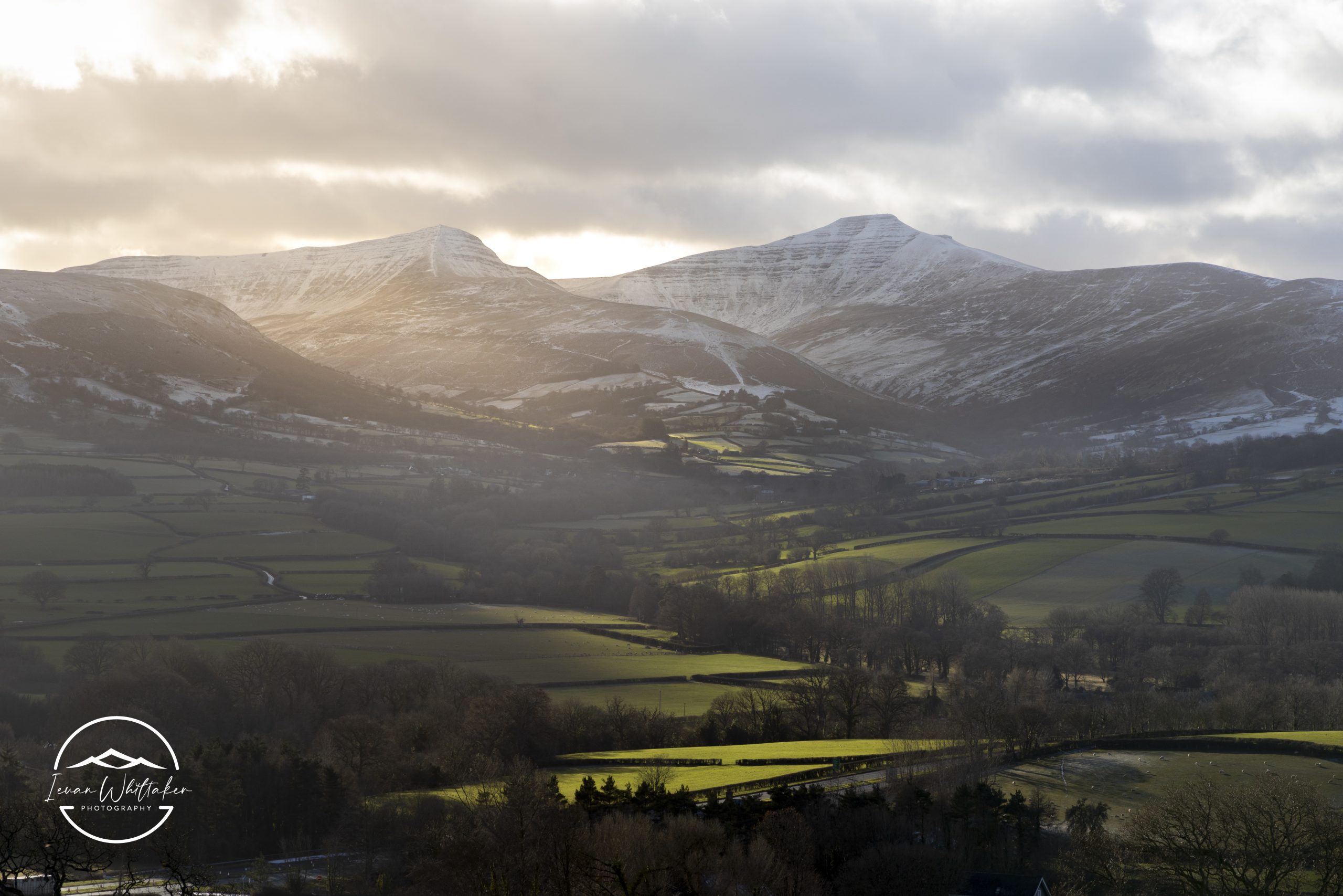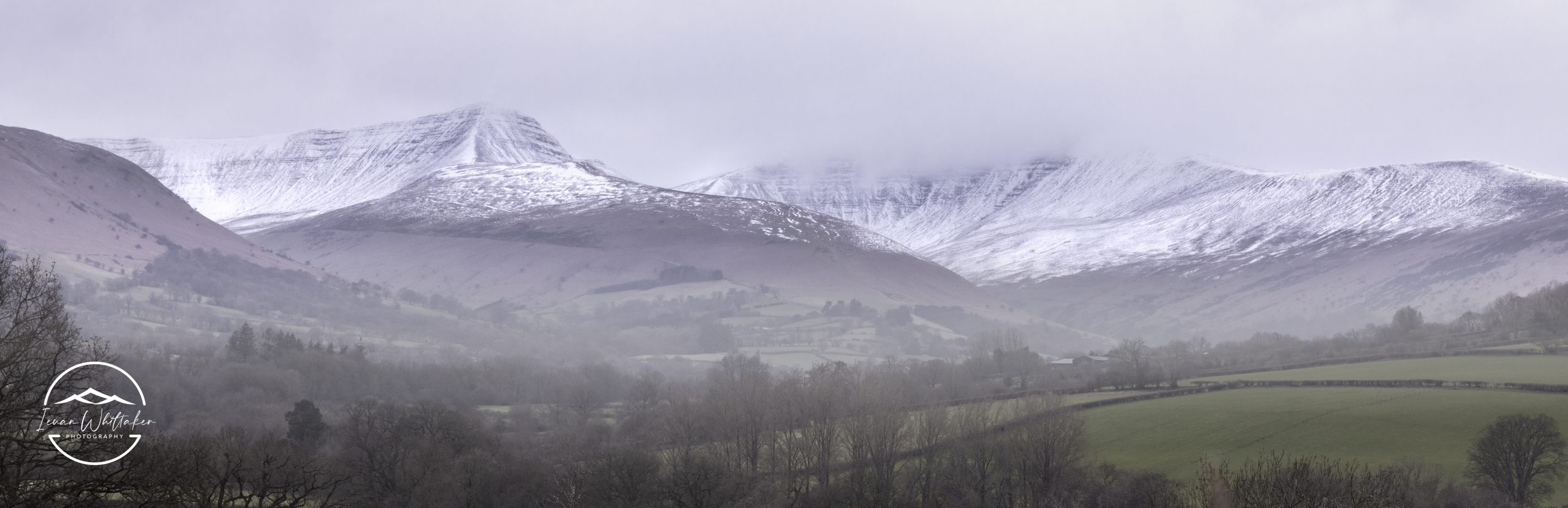 Brecon Beacons covered in snow with lush green fields below