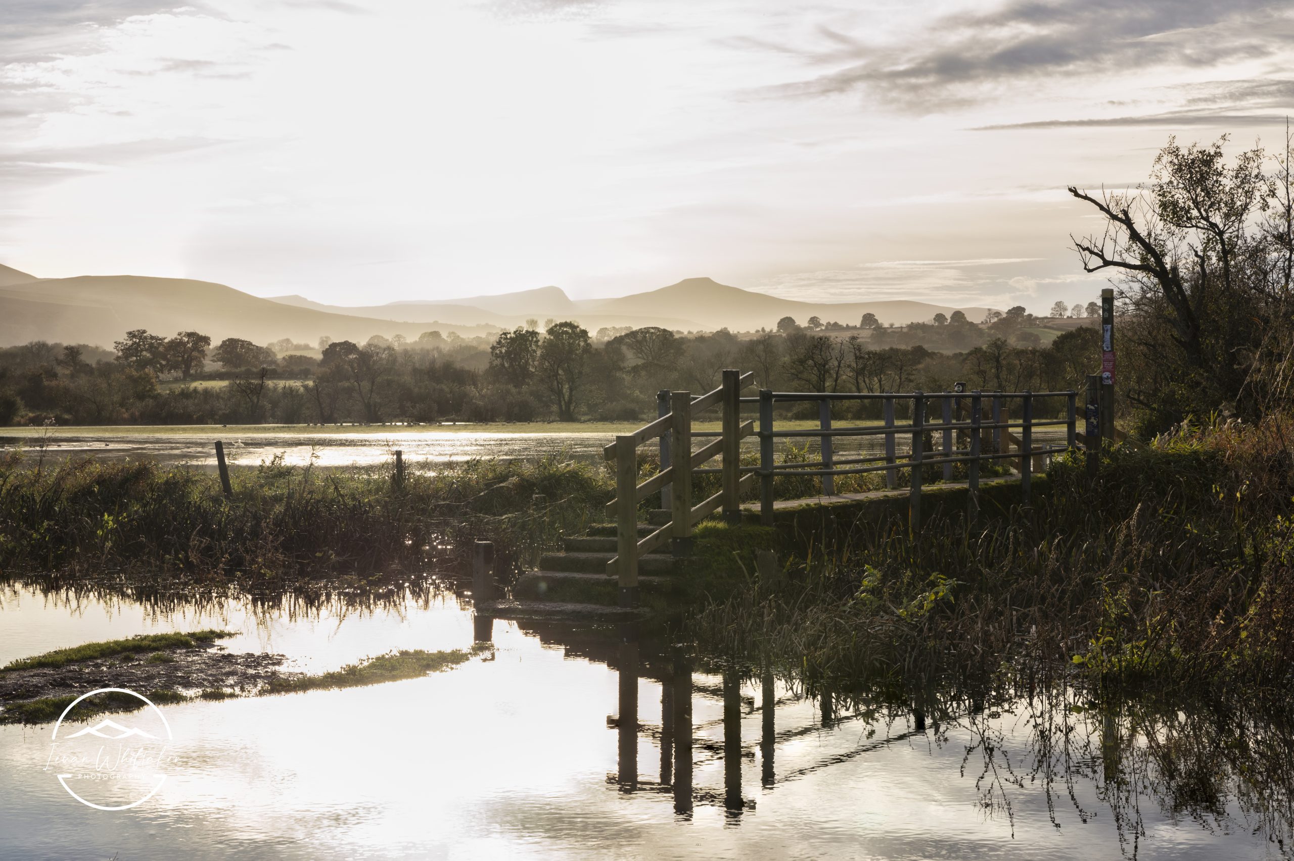 The Brecon Beacons rising above flooded farmland around Llangorse Lake